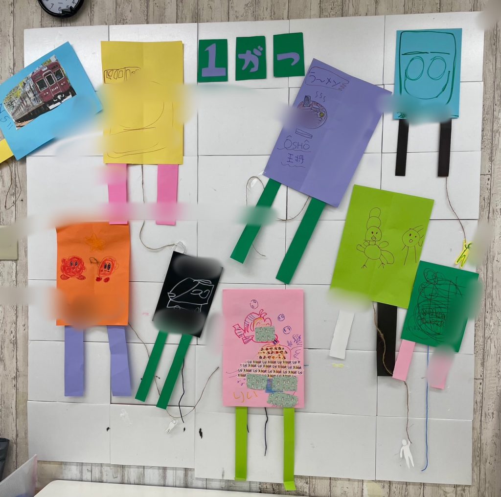 大きな凧も1枚作りました。子ども達の手形を模様にしたり、マスキングテープを貼ってあとから
